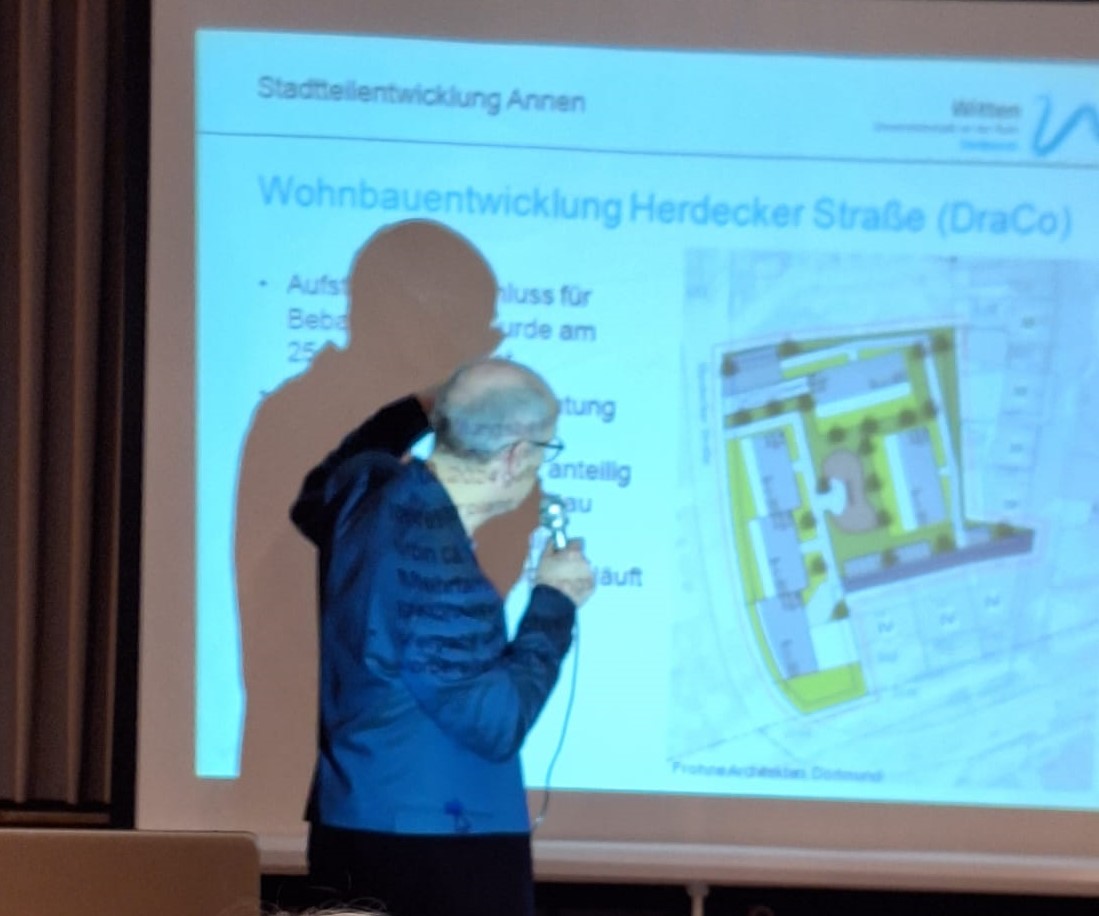 Eingeladen war der Stadtbaurat, Herr Rommelfanger, der anhand einer Power-Point-Präsentation verschiedene Bauvorhaben bzw. den Stand von Bauvorhaben vorstellte: Bildungsquartier, Thyssendeponie, Eisenwerk Böhmer, Brückenbaumaßnahmen, Waldstraße, um nur wenige zu nennen. Viel Wohnbebauung ist angedacht und am Bahnhof Annen-Nord wird hoffentlich in den nächsten Jahren auch etwas passieren.